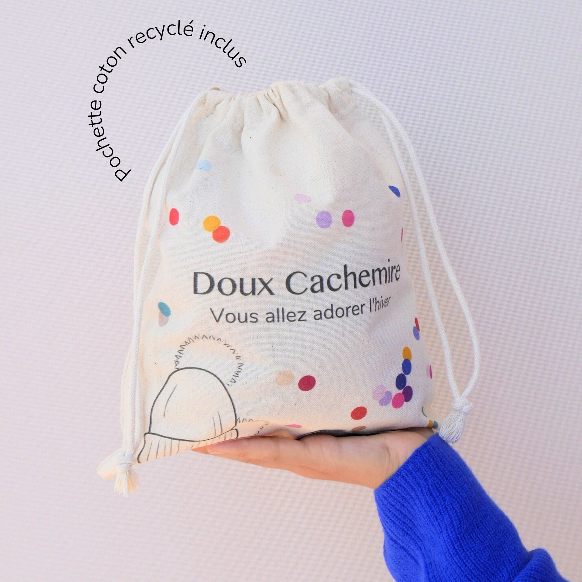 Each hat is carefully presented in a small organic cotton bag. This is practical for storing the pom-poms and allows the hat to be easily machine-washed without damage.