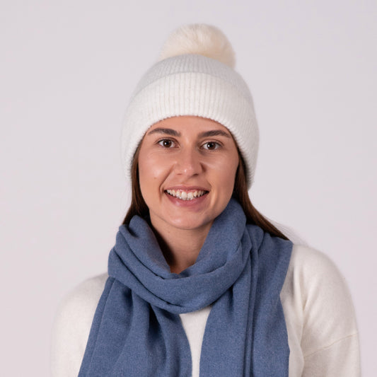 For a feminine look with maximum softness, choose a Doux cashmere scarf to match your women's pom-pom hat . Change the pom-pom depending on your mood and outfit, offering a variety of ways to express your creativity and unique style .