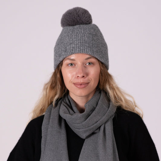 Cashmere hat in grey with pompom